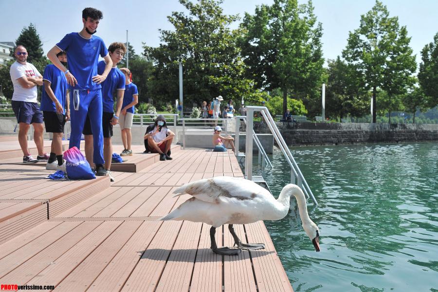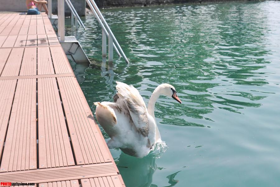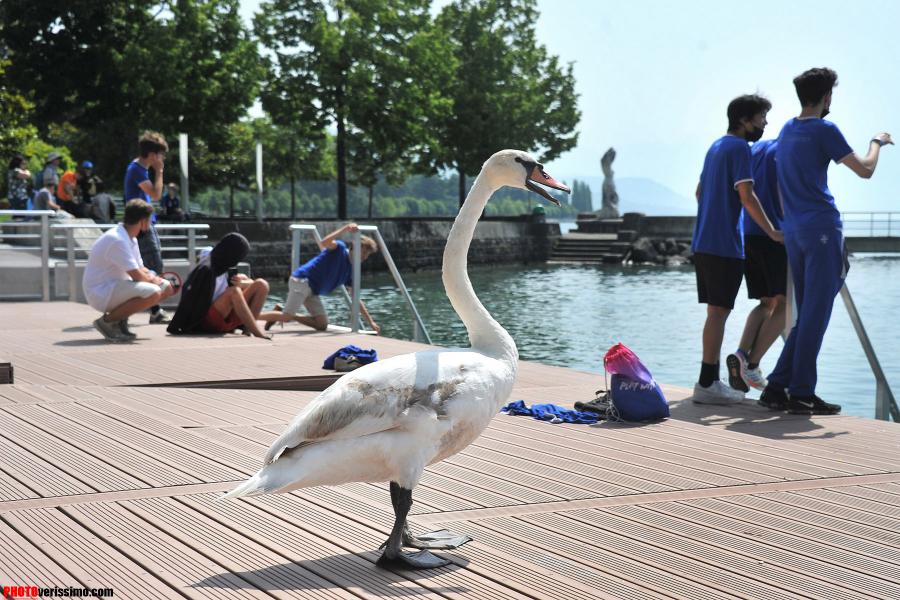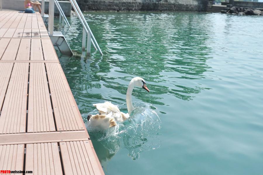 «Il a l’air désorienté!», nous disent quelques jeunes qui se trouvaient sur la plateforme de la nouvelle zone de baignade du Vieux-Port d’Ouchy, à Lausanne. En effet, ce jeune cygne a été vu d’abord en train se balader sur le trottoir entre les passants. Puis, il est entrée dans la zone des bains où il est resté une quinzaine de minutes probablement pour tester les lieux, avant de se décider à plonger dans les eaux du Léman, ceci malgré le panneau d’interdiction de plongée. © Valdemar VERISSIMO